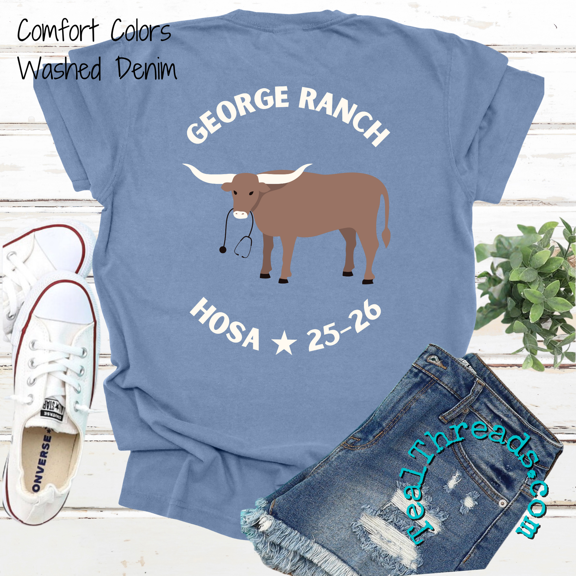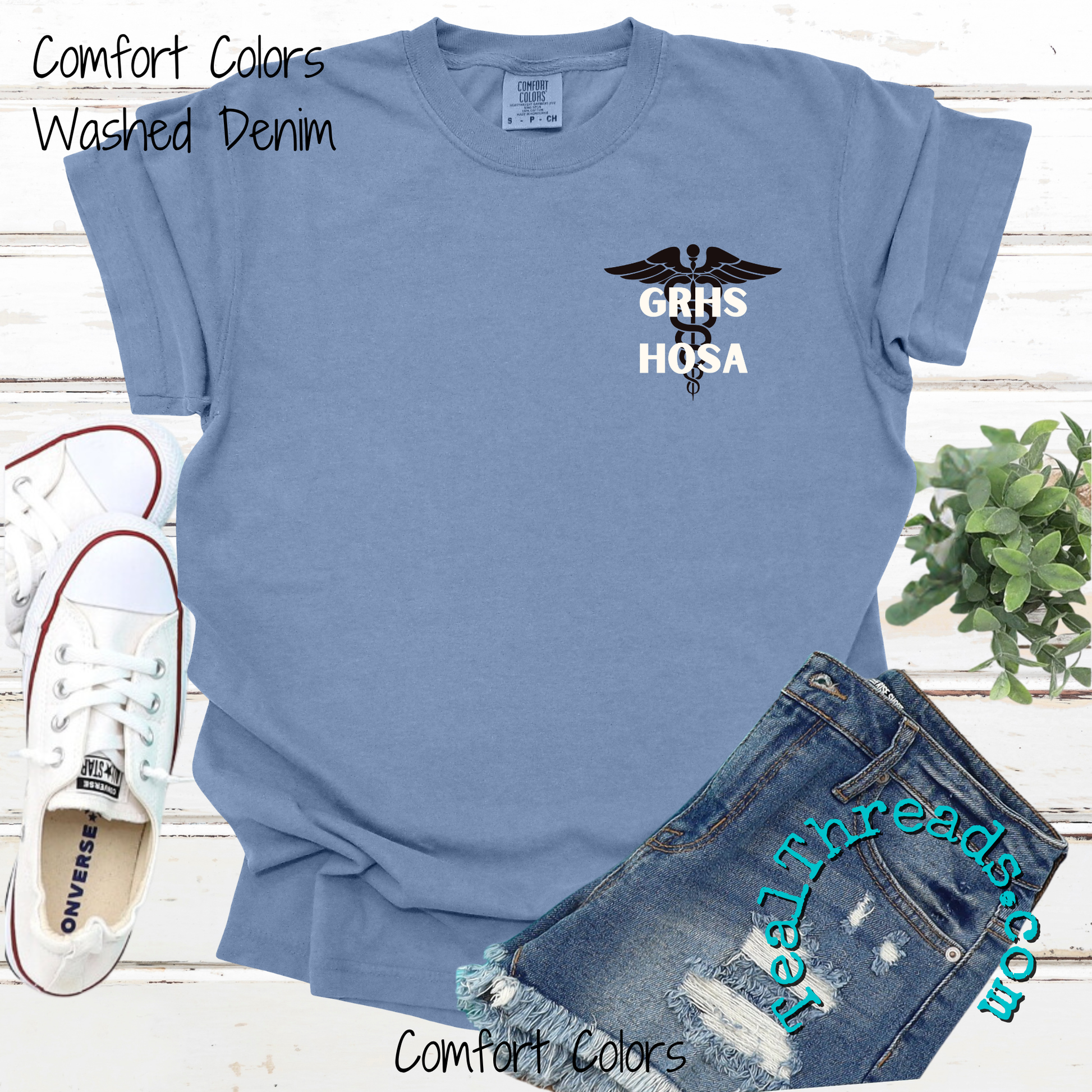 The 25-26 HOSA shirt comes with the design on the front and back as shown on a Comfort Colors unisex Washed Denim short sleeve shirt. Orders placed by Friday, November 7 will be individually packaged and shipped for free to the school in one shipment.